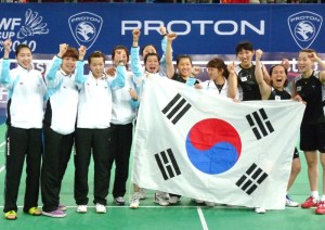 On 15 May, the day of Uber Cup final, Great Wall was finally collapsed by uprising Korean squad. Korean vanguard, BAE Seung Hee (world No.16) surprisingly overcame world No.1, WANG Yihen in straight sets (23-21,21-11) . And Korea’s 1st doubles followed, managed to beat China’s another world No.1 (18-21,21-12,21-15). Though China fought back in 2nd singles (21-14,16-21,21-7), Korea’s 2nd doubles did strike back again (19-21,21-14,21-19) and stopped China completely. This is the first time for Korea to become the title holder of Uber Cup since 1956