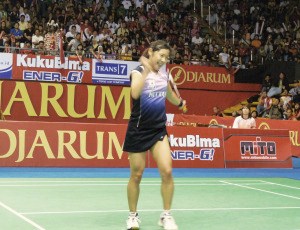インドネシアオープンスーパーシリーズ(SS)準決勝、女子シングルス、佐藤冴香選手の相手は、世界ランク246位ながら上位選手を倒して勝ち上がりベスト4入りした地元インドネシアの若手アナ・ロビタ選手。第1ゲームで 4-14、第2ゲームで7-15と、いずれも大きく先行される苦しい展開だったが、気持ちをとぎれさせることなく粘り強くプレーを続けた結果、両ゲームともに逆転 (22-20,21-17)で勝利。見事、決勝進出を決めた