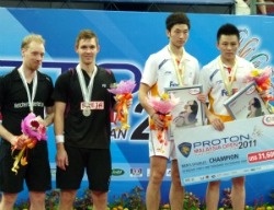 男子ダブルスは、準決勝で佐藤翔治・川前直樹組を下したデンマークの ヨナス・ラスムセン/マッズ・コンラドペターセン組(世界77位)が、中国のチャイ・ビャオ/グオ・ツェンドン組(中国)に挑んだ。結成から約5カ月のデンマークペアにとって初めての中国選手との対戦だったが、中盤まではしっかりついていった。しかし終盤に入ると徐々に点差が開き、最後は16-21,14-21で敗れた