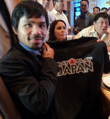 PRAY&PLAY for JAPAN は、3月11日に日本の東北地方を突然襲った地震と津波の被災者へ思いを抱く人に、チャリティーTシャツの購入を通じて義援金を送ってもらうと同時に、このシャツを着てさまざまなスポーツを楽しむことでその思いを広く周囲に伝えてもらおうという取り組み。いまやアジアから世界のスポーツアイコンとなった当地のボクサー、マニー・パッキャオ選手からも直接、賛同を得た