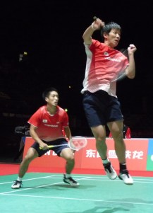 一方、日本の男子ダブルス3ペアは、それぞれ世界1位、2位、3位との厳しい戦いとなった。先陣を切って登場した佐藤翔治・川前直樹組は、今大会第1シード、ディフェンディングチャンピオンの中国カイ・ユン/フー・ハイファン組(世界1位)との真っ向勝負に挑み、17-21,21-15で1ゲームオールのタイに持ち込む。しかしファイナルゲームに入ると、「序盤からカイ選手がスピードを上げてきて、11点までは対応できなかった」(佐藤選手)ことで、インターバルまでに5-11と大量リードを許す。後半に入り徐々に食らいつくも、前半につけられた差を埋め切れず、14-21で試合を終えた