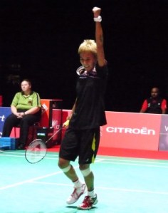 この日は女子シングルスで、世界ランク1位、優勝候補筆頭の中国ワン・シーシャン選手が、台湾のチェン・シャオチエ選手にストレート負け(16-21,17-21)する波乱があった。ただしチェン選手は、小柄ながら巧みな技術と驚異的なねばりでこれまで何度も中国選手をはじめとする世界の強豪を打ち破ってきている実力者。この日の試合でも随所に彼女らしさを見せ、ウェンブリーの観衆を味方につけた