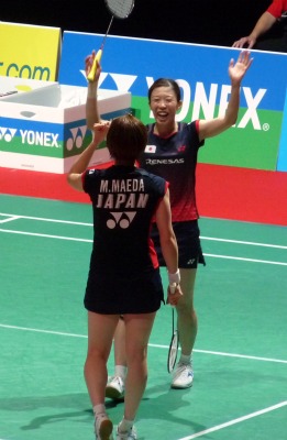 相手は、男女混合国別対抗戦スディルマンカップで日本チームのメダル獲得を事実上阻んだ、インドネシアのトップペア、グレイシア・ポリー/メイリアナ・ジャウハリ組(世界8位)。第1ゲームは末綱・前田組が中盤以降に抜け出し21-15で先取。第2ゲームに入るとインドネシアペアの粘りに遭い、9-4とリードした場面から7連続失点で一時は逆転を許す。ただその後徐々に挽回し、最後は21-17で勝利を手にした