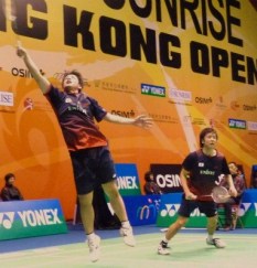 日本選手の中で最後に香港体育館のコートに立った平田典靖・橋本博且組は、世界2位の強豪、韓国チョン・ジェソン/イ・ヨンデ組と対峙。時折鋭いラリーを見せるものの、韓国ペアの鉄壁なディフェンスと強烈なオフェンスの前に、第1、第2ゲームともに中盤以降押し切られる展開で、13-21,15-21とストレート負けした。2009年のこの大会で対戦した時(9-21,8-21)より得点は増えたが、これで通算対戦成績は0勝2敗となった