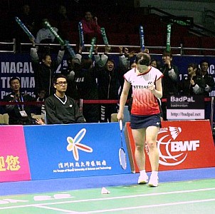 決勝は、第1シングルスの佐藤冴香選手が格上のリ・シュエリ選手に挑むも、フルゲームの末に敗れたところからスタートした。続いて第1ダブルスの藤井瑞希・垣岩令佳組が、世界2位のツァオ・ユンレイ/ティエン・チン組と対戦。昨年12月のスーパーシリーズ(SS)ファイナルで勝っており、勝機は十分あったが、第1ゲームを競り合いながら落とすと、第2ゲームは中国(=世界)ナンバー2に力及ばずストレート負けした
