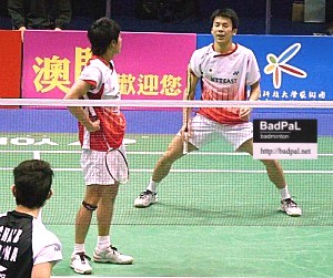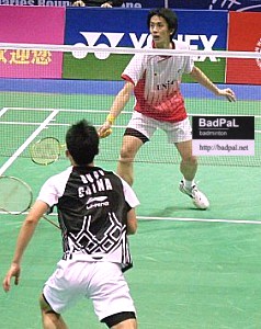 第1ダブルスの佐藤翔治・川前直樹組は、中国の2番手、グオ・ツェンドン/チャイ・ビアオ組と初対戦。序盤から点の取り合いとなるが、8-8からじりじり離され第1ゲームを17-21で失う。第2ゲームは先行されるが徐々に追い上げ。14-14で追いつくと、良いリズムで17-14とリードを広げ一気に逃げ切れるかと思われた。しかし、ここからミスが続き19-19で並ばれると逆転も許し、最初のマッチポイントこそ回避できたものの20-22で力尽きた