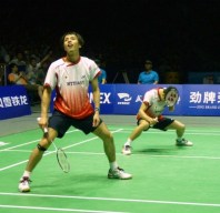 続いて佐藤翔治・川前直樹組が、世界ランク1位のツァイ・ユン/フー・ハイファン組に挑んだ。過去5戦して勝ちのない強豪相手に一歩も引かないプレーを見せ、わずかな得点差のまま終盤へ。19-20と先にゲームポイントを握られるが、これを凌いで21-20とゲームポイントを奪い返すなど、23-25で振り切られるまで、ギリギリの攻防を展開した。第2ゲームに入っても一進一退が続き15-15まで進む。ただここで3連続得点を許したのが響き、追い上げ及ばず18-21で惜敗した