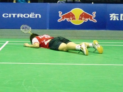 第2シングルスに登場した田児賢一選手は、ジュニア時代から競い合っている同じ1989年生まれのライバルで、その実力を認めるチェン・ロン選手と対戦。第1ゲームは中盤まで互角の試合を見せるが、後半に入ると世界3位のチェン・ロン選手が勝り、一気に点差を広げられて13-21で落とす。第2ゲームも攻守ともにチェン・ロン選手が一枚上手で、田児選手は前日のインドネシア戦に比べショットの精度が落ち、3-13と大差をつけられる。終盤追い上げを見せたが点差は埋まらず、16-21で敗れた