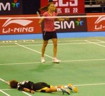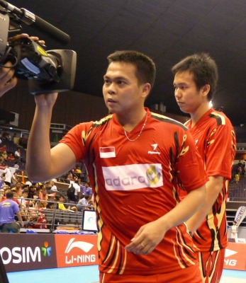 男子ダブルスは、韓国五輪代表のユ・ヨンソン/コ・ソンヒョン組が、五輪出場を逃したインドネシアのマルキス・キド/ヘンドラ・セティアワン組と対戦。互いに1ゲームずつ取り合い迎えたファイナルゲーム、北京五輪金メダリストのインドネシアペアが本領を発揮。攻撃がことごとく決まり、完全にゲームを掌握し、世界ランク4位の韓国ペアに21-6と圧勝した