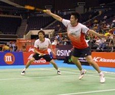 男子ダブルスの早川賢一・遠藤大由組は、北京五輪金メダリストのマルキス・キド/ヘンドラ・セティアワン組に挑んだ。第1ゲームは中盤、速い展開のゲームに対応し た早川・遠藤組が抜け出し、そのまま21-16で先取した。しかし第2ゲームに入ると地力に勝るキド/セティアワン組が攻勢となり、早川・遠藤組はこの ゲームを11-21で落とす。迎えたファイナルゲームでは、何とか追いすがろうとする日本ペアを尻目に、インドネシアペアが効果的な攻撃で徐々に点差を広 げ、終わってみれば一度もリードを譲らぬまま21-16で振り切った