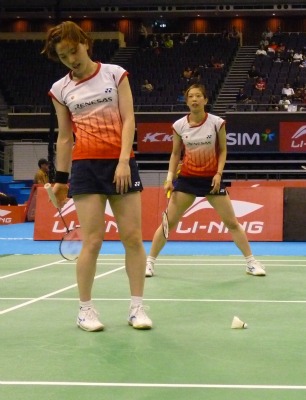 前日会場を沸かせた女子ダブルスの末綱聡子・前田美順組は、日本ペアに負けなしの13連勝中の中国の若手バオ・イーシン/ツォン・チエンシン組からの初勝利奪取を目指した。しかし試合は序盤から中国ペアのペースで進み、第1ゲームは一度もリードを奪えぬまま15-21、第2ゲームに入るとさらに点差は開き8-21で敗れ、日本勢としては14敗目を喫した