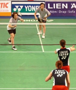ベトナムオープングランプリ(GP)3日目、各種目ベスト8入りをかけた対戦が行われ、女子ダブルスで馬上愛実・下﨑彩組が、これまで一度も勝ったことのない今大会第1シード、松尾静香・内藤真実組をフルゲームの末に下す金星を上げた