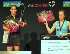 女子シングルスのファイナリストは、それぞれロンドン五輪金メダルのリ・シュエリ選手と銀メダルのワン・イーハン選手に勝って決勝進出を果たした、ユリアン・シェンク選手(ドイツ)とサイナ・ネワル選手(インド)。シェンク選手は、全種目を通じて決勝進出を果たした唯一の欧州選手として、デンマークの観客から熱い声援を受けたが、この日はネワル選手がすべてにおいて1枚上手。第1、第2ゲームともに試合をコントールしてストレート勝ちを収め、年間5大会行われるSSプレミアで、6月のインドネシアオープンに続く2つ目のタイトルを手にした