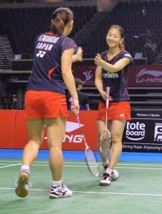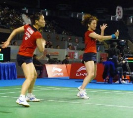 日本からはもう1組、女子ダブルスの高橋礼華・松友美佐紀組がベスト4に入った。対戦したのは、前週のインドネシアオープンSSプレミアで優勝した中国チェン・シュウ/バオ・イーシン組。実力者2人が新たに組み始めたペアで、とりわけバオ選手は、2011年ジャパンオープンSSで、当時の日本のトップペア3組を次々と倒しSS初優勝を果たすなど、若き日本キラーとして知られる。しかしこの日は、高橋・松友組が試合をコントロール。第1ゲームを21-9の大差で取ると、第2ゲームも中盤までダブルスコア(14-7)でリードする。ここから徐々に追い上げられ、18-17と1点差まで詰め寄られるが、ネットに当たって相手コートに落ちる幸運なポイントもあり、21-18で振り切った