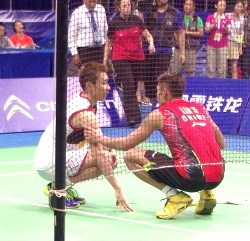 世界選手権7日目、注目の男子シングルス決勝、リー・チョンウェイ対リン・ダンは、2011年の世界選手権決勝、12年のロンドン五輪決勝に続いてまたもファイナルゲームまでもつれる接戦となった。しかし今回は、ギリギリのところでリー選手の負傷棄権という予期せぬ結末を迎えた