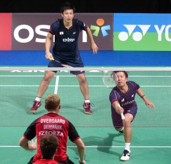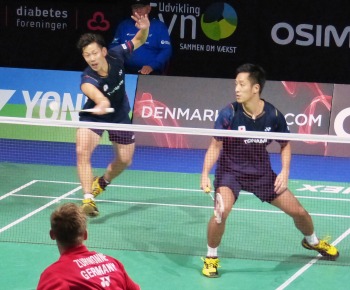 同じく、デンマークオープンデビューとなったのが園田啓悟・嘉村健士組。試合後、「初めての大会で少し緊張したが、プレーする中で気持ちを調整できた」(園田)。「観客席が暗く、コートがライトアップされた今大会の会場は見やすいと感じた」(嘉村)と語ったように、第2ゲーム終盤、勝利が見えた場面(19-13)から少しもたついた以外は、バタバタすることなく世界ランク下位のデンマークペアからしっかり勝利を手にした