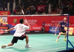 男子はこの日、準決勝2試合を行い、日本ユニシスはジャヤラヤ・ジャカルタに0対3で敗れ、決勝進出を逃した。最初の種目、第1シングルスは上田拓馬選手と田児賢一選手の日本人対決。第1ゲームは上田選手が競り合いを制し22-20で取るが、その後は地力に勝る田児選手が徐々に引き離し、第2、第3ゲームを連取してジャヤラヤに最初のポイントをもたらす