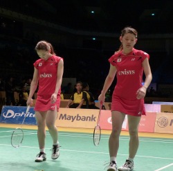 一方、女子ダブルスの高橋礼華・松友美佐紀組は、早川・遠藤組と同じく通算5度目のSS決勝進出をかけ、ダブルスのスペシャリスト、マー・ジン選手率いる新しい中国ペアと対戦した。予選からの出場ながら、インドネシア、デンマーク、韓国の強豪ペアを連破してきた中国ペアの実力は本物で、第1ゲーム中盤以降抜け出され、このゲームを17-21で落とす。第2ゲームは完全に主導権を奪われ、前半で3-11と大量リードを許してしまうと、反撃の糸口を見出せないまま、なすすべなく12-21で敗れ、決勝進出は果たせなかった