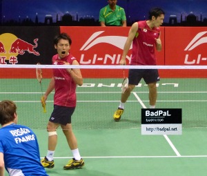 【第2ダブルス】 園田啓悟・嘉村健士〈21-8,21-13〉バスティアン・カーサウディ/ゲータン・ミッテル・ハイザー