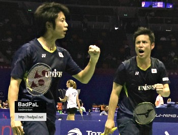 「先鋒」の早川賢一・遠藤大由組が口火を切った。前回2013年クアラルンプール大会の準々決勝、メダルのかかったタイとの一戦で、普段なら勝てる相手にチームの敗北につながる痛い負けを喫した日本のトップペアは、今大会も一次リーグ初戦でロシアペアに敗れる嫌なスタート。この日は世界ランク上位の台湾ツァイ・チアシン/リー・シェンム組から序盤にリードを奪うが、まだ本来の動きではなく、後半逆転され15-19と追い詰められる、しかしここから6連続得点を決め第1ゲーム、逆転勝ちした。第2ゲームは一進一退の攻防で終盤までいくが、少しずつリズムを取り戻し、18-17から振り切って実力拮抗の難しい相手に勝利した