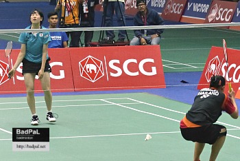 この日、最も決勝に進む可能性が高かったのは女子シングルスの荒木選手。しかし、開催国タイ期待のチョチュウォン・ポーンパウィー選手に第1ゲーム開始直後から得点を重ねられ、後半追い上げるも序盤に許したリードが大きすぎて届かず、13-21で落とす。エンドの変わった第2ゲームはリズムをつかみ21-14で奪い返し、ファイナルゲームも、競り合いとなるも、リードして前半を折り返す。ところが後半途中から連続得点を決められると、焦りからかミスも出て、流れを呼び戻すことはできず、15-21で敗退となった