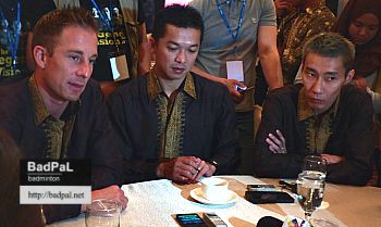 今回は、リン・ダン選手が急きょ帰国を余儀なくされ、ビデオメッセージのみの参加となったが、前日に世界選手権決勝を戦ったばかりのリー・チョンウェイ選手を含む3人が、70回目のインドネシア独立記念日に当たる17日、ジャカルタのホテル内に設けられた会場に顔を揃えた