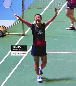 3年ぶりの出場で高まる気持ちを冷静さに変えた奥原選手が、中国のトップ選手2人を連破して勝ち上がった山口選手を抑え込んだ。日ごろから攻撃力では劣ると認める奥原選手は、第1ゲームから得意とするラリー戦に持ち込み試合をコントロール。どんな球にもくらいつく山口選手の追撃をかわし21-18で取って先行する。第2ゲームも奥原選手のペースで進み、流れを断ち切ろうとする山口選手のショットにミスが出はじめると実力差以上に点差が開き、奥原選手が21-12で快勝した