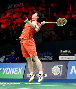 女子シングルスの山口選手が、五輪銅メダル奥原希望選手に続いて、金メダルのマリン選手も倒した。今大会、体がよく動いている19歳は、同じフォームから異なるショットを繰り出すディセプションなどが機能し、オープニングゲームを先取。第2ゲームも15-11とリードする。しかし、あきらめないマリン選手に長いラリーをからめた2度の連続得点を決められ逆転でこのゲームを落とす。ただ、ファイナルゲームに入っても山口選手の躍動は止まらず、序盤6-1とリード。ここから1点差まで詰め寄られるが、11-7で前半を終える。後半も流れは変わらず、そのままマッチポイント。最後にミスで3連続失点したものの21-18で勝利し、決勝進出を決めると同時に、世界ランク1位との対戦成績を2勝2敗のタイに戻した