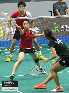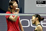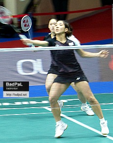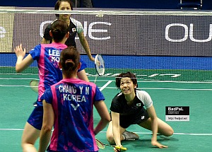 前々週インドオープン優勝の米元・田中組は、韓国ペアを相手に第1ゲーム、21-11と圧倒する。第2ゲームは16-16から抜け出され落とすが、ファイナルゲームに入ると次々に得点を重ね、前半を11-3の大差で折り返す。後半も18-9までリードを広げ、勝利は確定したかにみえた。ところが、ここからまさかの7連続失点で18-16。その後、20-17とマッチポイントをつかむが、再び追い上げられ20-19まで詰め寄られる。次の1点を取ってことなきをえたが、とりわけ精神面の課題を露呈した初戦となった