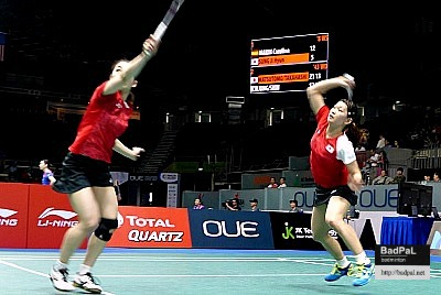 もうひと試合は、韓国キム・ギジョン/シン・スンチャン組が世界2位の中国ルー・カイ/ホワン・ヤチオン組から第1ゲームを先取するが、地力に勝る中国ペアが続く2ゲームを奪い返し、今シーズン5大会連続(このうちSS4大会)となる決勝進出を決めた