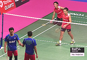 男子ダブルスで決勝進出を狙った園田啓悟・嘉村健士組は、インドネシアのモハンマド・アーサン/ライアン・アグン・サプトロ組に自分たちのプレーをさせてもらえず、第1ゲームは一度のリードも奪えず、第2ゲームも10-8から逆転され、そのままストレート負け。この種目での日本勢のファイナリスト誕生は、次回以降に先送りとなった