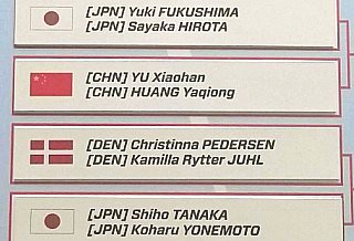【女子ダブルス】 チェン・チンチェン/ジア・イーファン(中国)<15-21,15-21>米元小春・田中志穂、福島由紀・廣田彩花<21-12,21-12>クリスティナ・ペダーセン/カミラ・リタ・ユール(デンマーク)