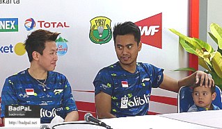 決勝の相手、インドネシアのグレイシア・ポリー/アプリヤニ・ラハユ組については、ホームということもあり「(最後に対戦した昨年9月の)ジャパンオープンの時より強くなっているように見える」と警戒感を示しながらも、「たくさん練習してきた。自信を持って臨みたい」(高橋)。「どこまでできるか、自分たちの持てる力をぶつける。今大会最後の試合なので楽しみたい」(松友)と意気込みを語った