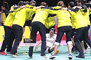 ところがいざふたを開けてみると、世界ランク34位の21歳は、プレッシャーのかかる状況にも萎縮することなく、のびのびしたプレーを見せ、そうした見方を一掃する。第1ゲーム序盤から先行し、後半追い上げられ逆転を許すも、21-18で振り切る。第2ゲームは7-6までもみ合うが、そこからじりじり点差を広げ、相手に本来のプレーをさせないまま21-11と圧倒。勝利と同時にコートになだれこんできたチームメイトとともに喜びを分かち合った