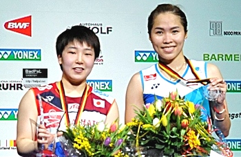 ドイツオープン(SUPER300)決勝、女子シングルスで山口茜がラッチャノク・インタノン(タイ)との接戦に勝ち、3連覇達成。同時に今大会、同国対決となった男子2種目に続く3つ目のタイトルを日本にもたらした