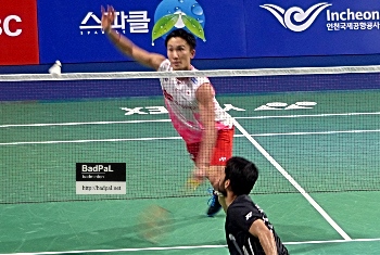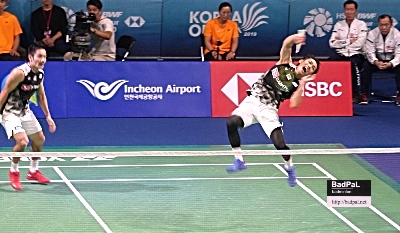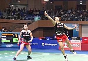 志田・松山は、前日、高橋礼華・松友美佐紀を破った韓国1番手、シン・スンチャン/イ・ソヒと互角に渡り合い、第1ゲームを奪う。第2ゲームは経験、実績共に上の相手に主導権を握られ13-19とリードされる。それでも集中力を切らさず、6連続得点で追いついてみせたが、地元で負けられない韓国ペアも意地を見せ、日本ペアに傾いた流れを断ち切り、試合はふりだしに