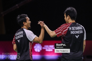 男子ダブルスでは、インドネシアのヘンドラ・セティアワン/モハンマド・アーサンが、勝てば一次リーグ突破、負ければ敗退、の一戦に臨んだ。後のない状況ながらベテランらしく、マレーシアのアーロン・チア/ソー・ウーイイクにきっちり勝って、インドネシア勢として唯一、決勝トーナメントに進んだ