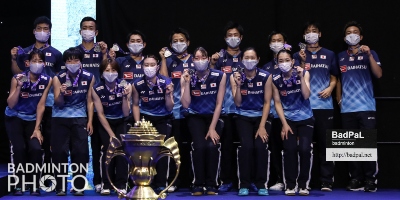 男子の国・地域別対抗戦トマス杯、一次リーグを順当に首位通過して準々決勝に臨んだ日本は、いきなり桃田賢斗と小林優吾・保木卓朗で星を落とす厳しい状況に。それでも、チーム力で巻き返して、ベスト4に勝ち残った ~photo courtesy of BWF/BadmintonPhoto