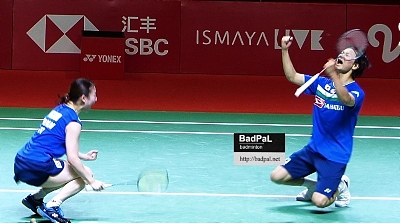 渡辺・東野は、インドネシアマスターズの同じく準決勝で、初めて敗れた香港のタン・チュンマン/ツェ・インシュ―とバリ島で2度目の対戦。1ゲームずつ取り合い迎えた第3ゲーム、終盤に逆転を許し18-19とリードされる。それでも踏ん張り、3連続得点を決めて、前々週に喫した初黒星の借りを返した
