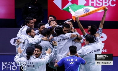 ともに前日の準々決勝で同じ状況下で戦い勝っている、デンマークの25歳ラスム・ゲムケとインドの29歳H.S.プラノイの試合は、オープニングゲームをゲムケが取るも、その後はプラノイが圧倒。2016年以来の優勝を狙ったデンマークの夢を阻み、インドチームとして史上初の決勝進出を果たした