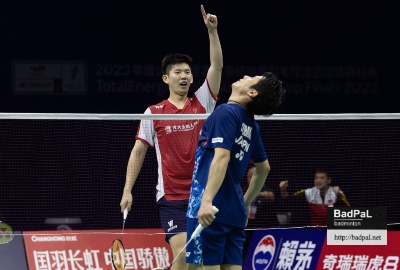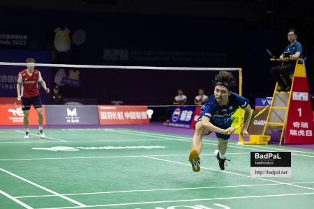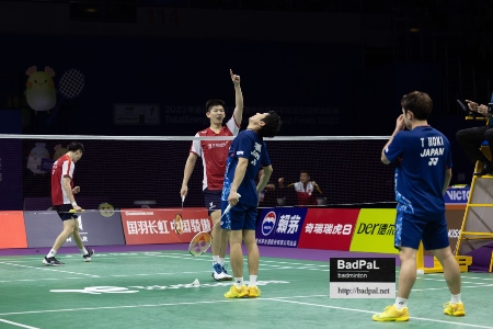勝てば決勝進出、という大事な場面で出番を迎えた小林優吾・保木卓朗だが、委縮する様子は見えず、第1ゲーム、常に先行する形で試合を進め、終盤に4連続ポイントを決め先制する。第2ゲームは途中、負けたら終わりの中国ペアの反撃に遭い、2点差で落とす。それでもファイナルゲームに入ると再び、中盤以降、主導権を握り返して18-12とリード。そののち少し追い上げられるが、20-16とマッチポイントに到達する